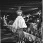 Partecipante al concorso di miss Mondo, in posa, si sorregge ad una asta, quasi a scivolarvi - totale
