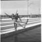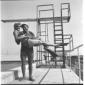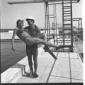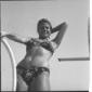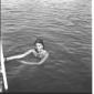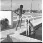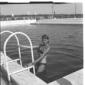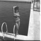 L'attrice Celina Cely in piedi sul bordo di una piscina di Fregene mentre si appresta ad entrare in acqua - totale