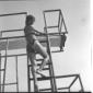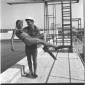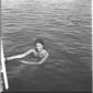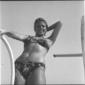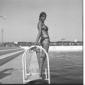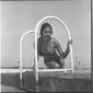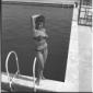L'attrice Celina Cely in piedi sul bordo di una piscina di Fregene mentre si appresta ad entrare in acqua - totale