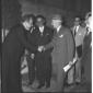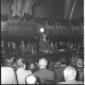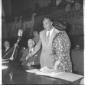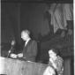 Segni ripreso davanti ad un microfono che tiene un discorso. Dietro ci sono Pella e altre personalitą. Totale