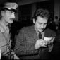 Domenico Modugno, la moglie Franca Gandolfi e Delia Scala scendono la scaletta di un aereo a Ciampino